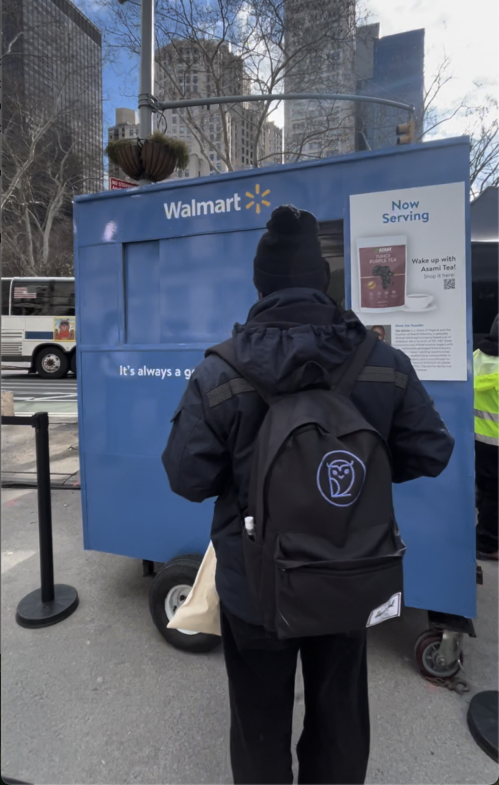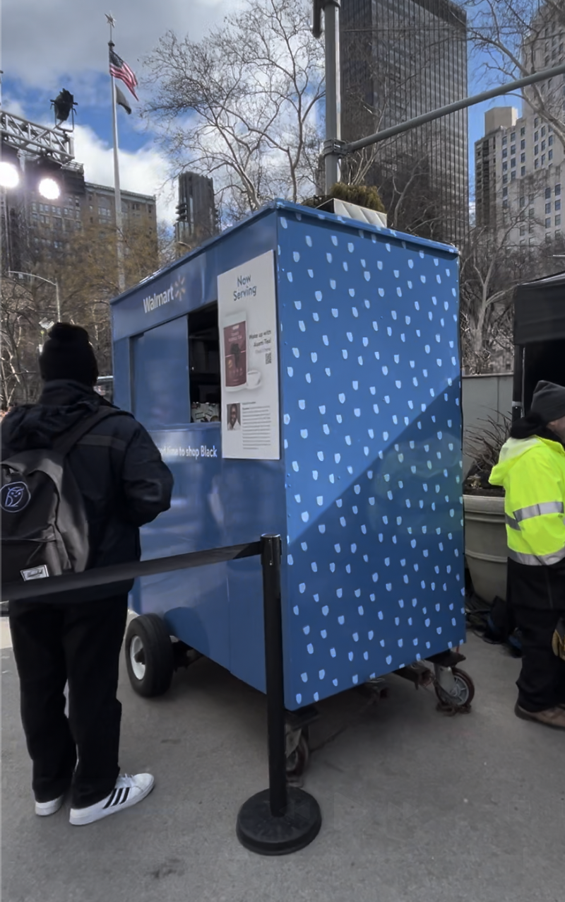 At the top of every hour in both NYC & LA, a 16 foot clock chimed as a signal that free full-size products were being distributed in branded Walmart tote bags to all who just happened to walk by.